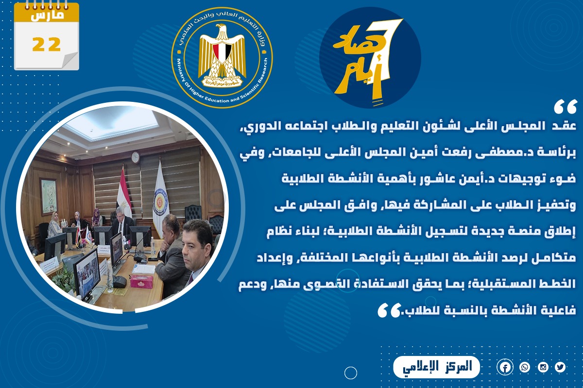 وفي ضوء توجيهات الدكتور أيمن عاشور بأهمية الأنشطة الطلابية وتحفيز الطلاب على المشاركة فيها، وافق المجلس على إطلاق منصة جديدة لتسجيل الأنشطة الطلابية؛ لبناء نظام متكامل لرصد الأنشطة الطلابية بأنواعها المختلفة، وإعداد الخطط المستقبلية؛ بما يحقق الاستفادة القصوى منها، ودعم فاعلية الأنشطة بالنسبة للطلاب.