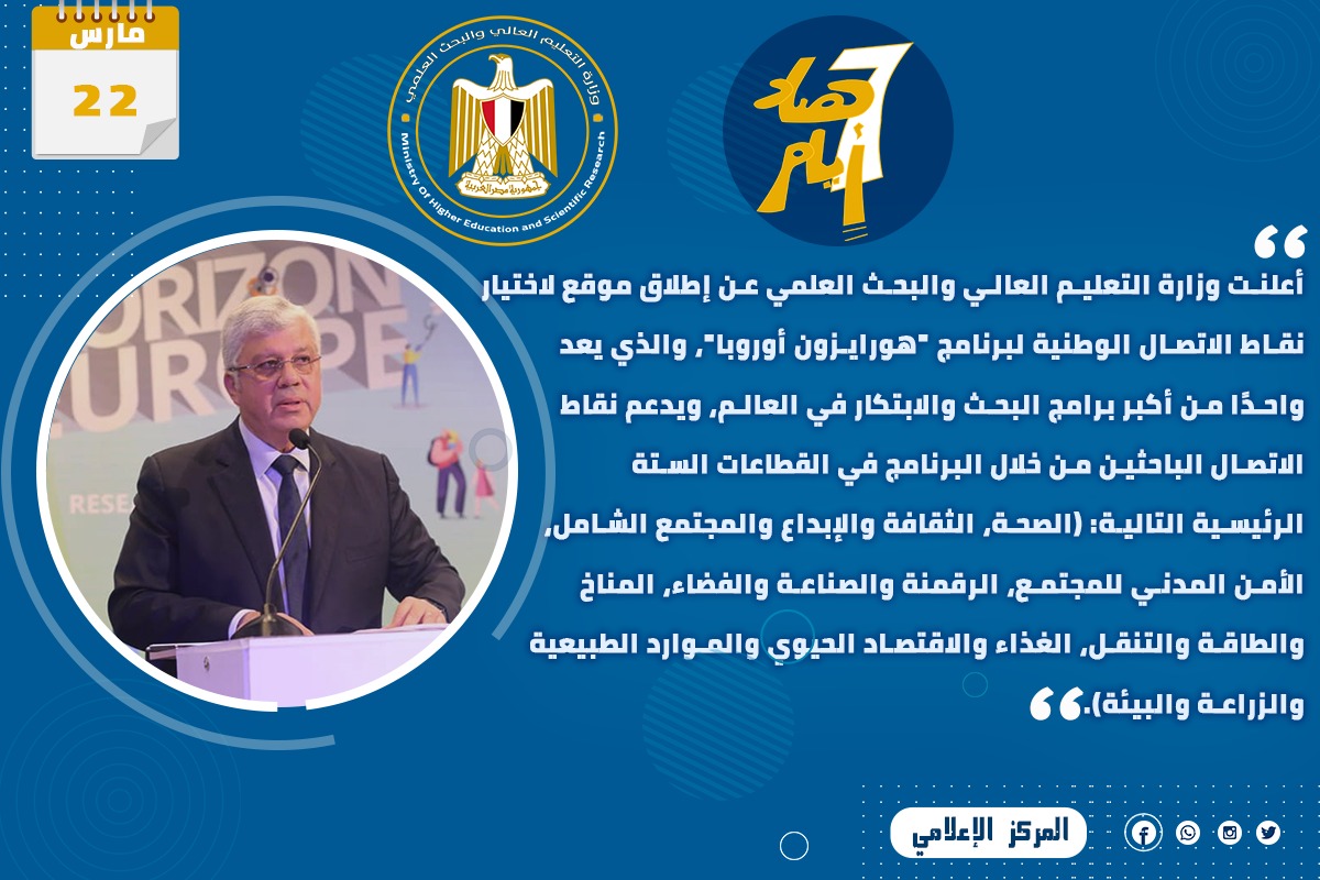 3) أعلنت وزارة التعليم العالي والبحث العلمي عن إطلاق موقع لاختيار نقاط الاتصال الوطنية لبرنامج "هورايزون أوروبا"، والذي يعد واحدًا من أكبر برامج البحث والابتكار في العالم، ويدعم نقاط الاتصال الباحثين من خلال البرنامج في القطاعات الستة الرئيسية التالية: (الصحة، الثقافة والإبداع والمجتمع الشامل، الأمن المدني للمجتمع، الرقمنة والصناعة والفضاء، المناخ والطاقة والتنقل، الغذاء والاقتصاد الحيوي والموارد الطبيعية والزراعة والبيئة).