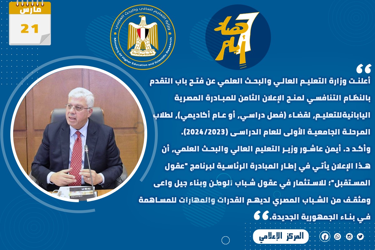 2) أعلنت وزارة التعليم العالي والبحث العلمي عن فتح باب التقدم بالنظام التنافسي لمنح الإعلان الثامن للمبادرة المصرية اليابانية للتعليم، لقضاء (فصل دراسي، أو عام أكاديمي)، لطلاب المرحلة الجامعية الأولى للعام الدراسى (2023/2024).