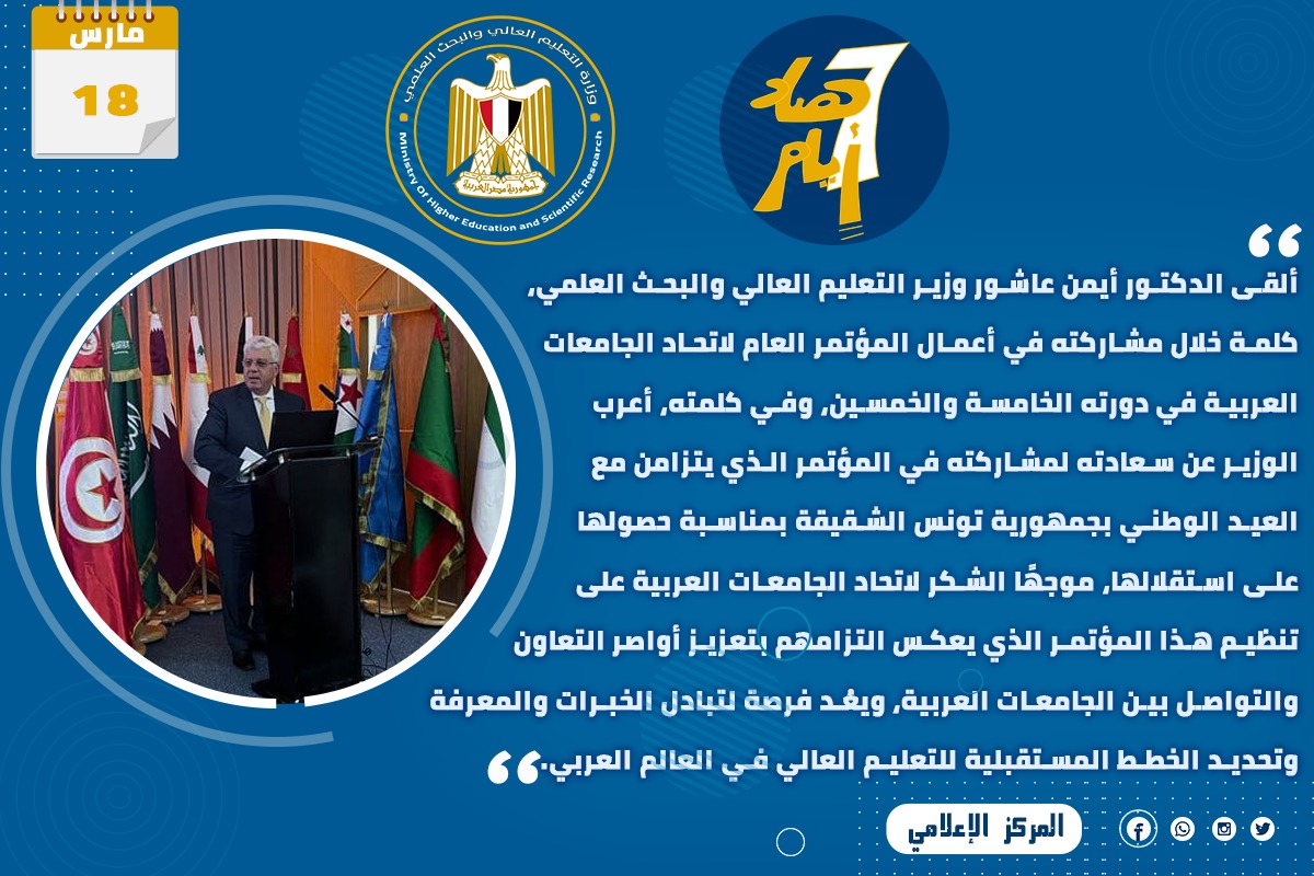 1) ألقى الدكتور أيمن عاشور وزير التعليم العالي والبحث العلمي، صباح يوم السبت، كلمة خلال مشاركته في أعمال المؤتمر العام لاتحاد الجامعات العربية في دورته الخامسة والخمسين، والذي يقام خلال الفترة من ١٨ إلى ٢٠ مارس الجاري، بحضور الدكتور عمرو عزت سلامة أمين عام اتحاد الجامعات العربية، والعديد من وزراء التعليم العالي بالدول العربية، والسفير إيهاب فهمي سفير مصر بجمهورية تونس، ولفيف من رؤساء الجامعات العربية.
