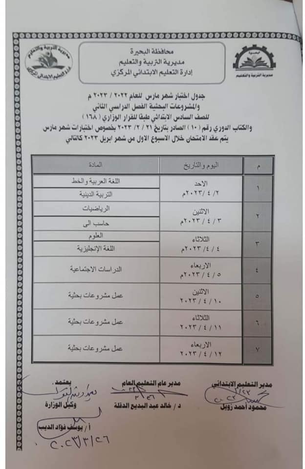 جدول اختبار شهر مارس والمشروعات البحثية للسادس الابتدائي بالبحيرة