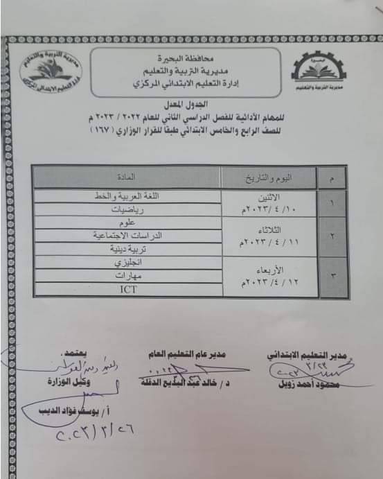 وأعلنت مديرية التربية والتعليم والتعليم الفني بمحافظة البحيرة، تعديل جدول امتحانات المهام الأدائية للفصل الدراسي الثاني للعام 2022/2023 للصف الرابع والخامس الابتدائي طبقا للقرار الوزاري 167.