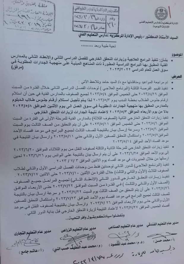 وجهت وزارة التربية والتعليم والتعليم الفني، خطابًا للمديريات التعليمية، بشأن تنفيذ البرامج العلاجية وزيارات التحقق الخارجي للفصل الدراسي الثاني والانعقاد الثاني بالمدارس الفنية المطبق بها البرامج الدراسية المطورة ذات المناهج المبنية على منهجية الجدارات المطلوبة في سوق العمل للعام الدراسي 2022/2023.