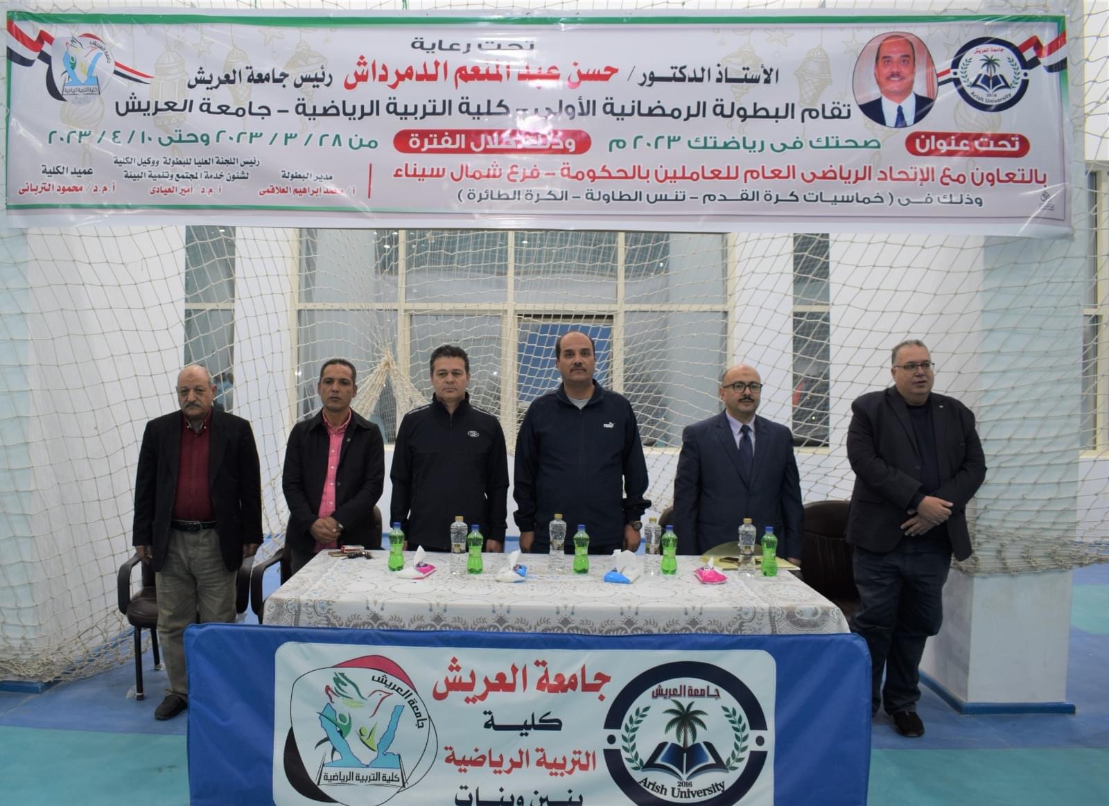 جاء ذلك بحضور محمد العلاقمي، رئيس الاتحاد الرياضي الفرعي للمصالح الحكومية بشمال سيناء، ومدير البطولة، والدكتور محمود الترباني، عميد التربية الرياضية، والدكتور أمير العيادي، وكيل الكلية لشئون خدمه المجتمع وتنمية البيئة، ورئيس اللجنة العليا للبطولة، ومنسقي الأنشطة الطلابية بالجامعة، وعدد كبير من أعضاء هيئة التدريس ومعاونيهم، والعاملين بالجامعة، ولفيف من القيادات الشعبية والتنفيذية بشمال سيناء.
