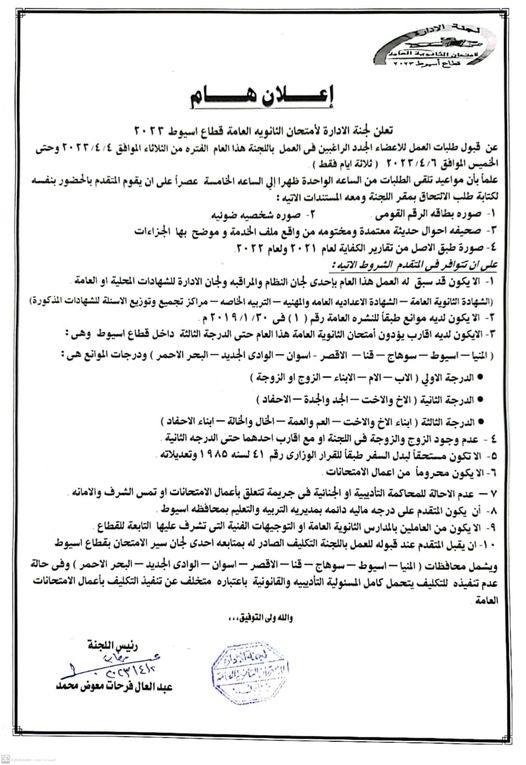 أعلنت لجنة الإدارة لامتحانات الثانوية العامة قطاع اسيوط ۲۰۳۳ عن قبول طلبات العمل للاعضاء الجدد الراغبين في العمل باللجنة هذا العام، في الفترة من الثلاثاء الموافق ٢٠٢٣/٤/٤ وحتى الخميس الموافق ۲۰٢٣/٤/٦ ( ثلاثة أيام فقط )