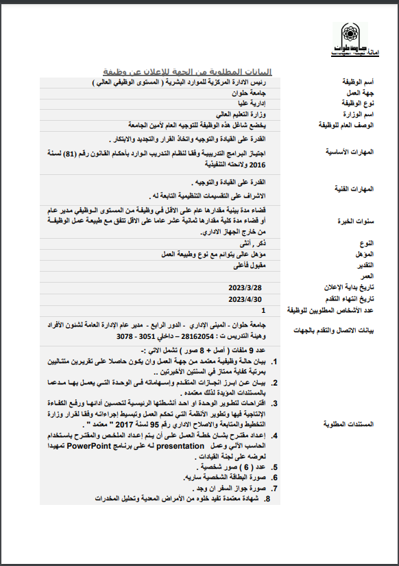 أعلنت جامعة حلوان عن وظائف قيادية شاغرة في 6 إدارات عامة بالجامعة وهى كالتالي "رئيس الإدارة المركزية للموارد البشرية - مدير عام الإدارة العامة للتطوير المؤسسي - مدير عام الإدارة العامة لإدارة وتنمية المواهب - مدير عام الإدارة العامة للاستحقاقات والمزايا - مدير عام الإدارة العامة لعمليات الموارد البشرية - مدير عام الإدارة العامة للإدارة الاستراتيجية"، والتقديم خلال الفترة من يوم 2023/03/28 حتى يوم 2023/04/30، وعلى من يرغبي في التقديم التوجه لـ"جامعة حلوان - المبنى الإداري - الدور الرابع - مدير عام الإدارة العامة لشئون الأفراد وهيئة التدريس".