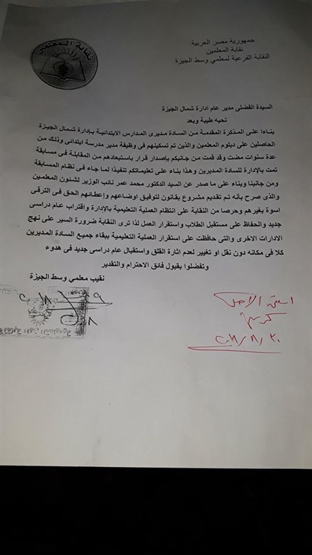 طالبت نقابة المعلمين بوسط الجيزة برئاسة سعيد إسماعيل، إدارة شمال الجيزة التعليمية التابعة