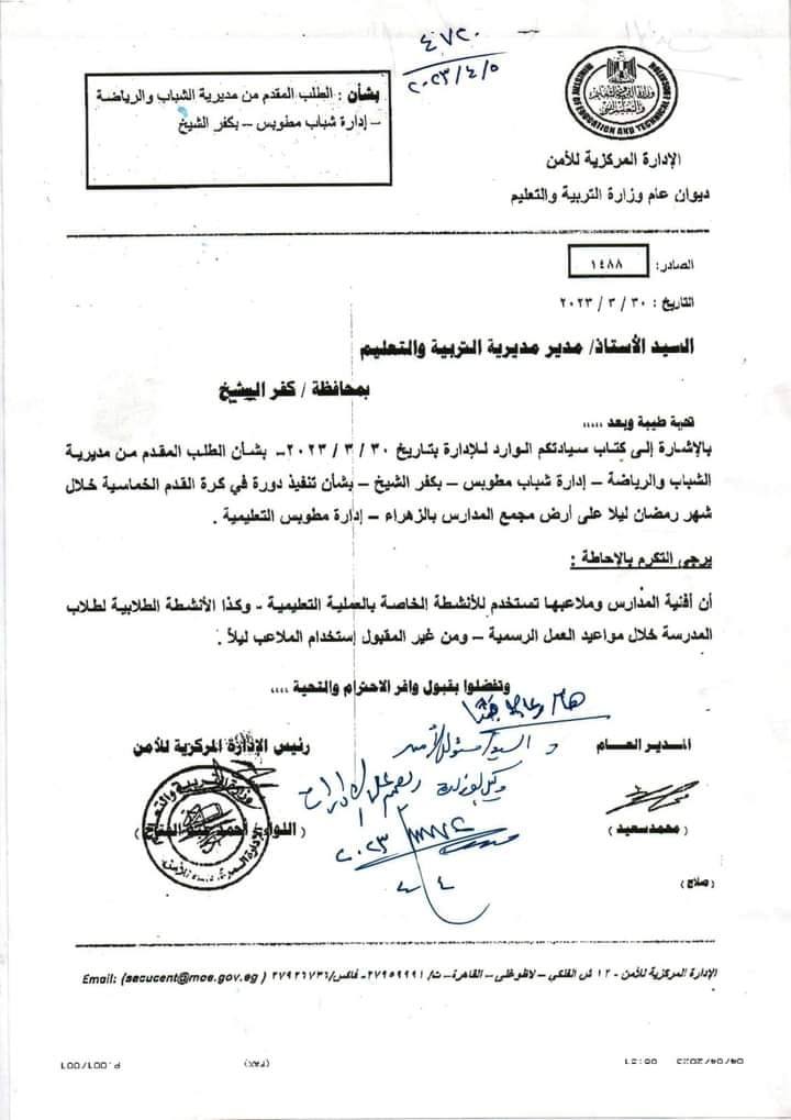 وجهت الإدارة المركزية للأمن بديوان عام وزارة التربية والتعليم والتعليم الفني، خطاب للمديريات التعليمية، بشأن تنفيذ دورة كرة القدم الخماسية خلال شهر رمضان ليلًا على أرض مجمع المدارس بالزهراء إدارة مطوبس التعليمية بكفرالشيخ.