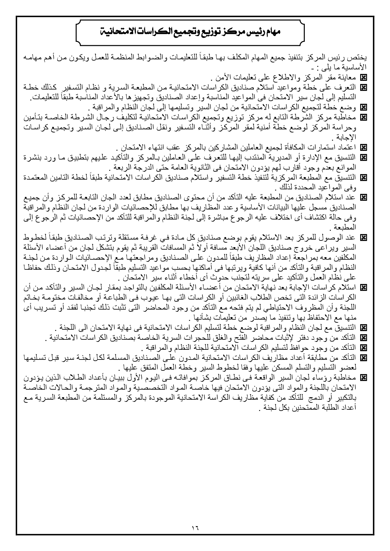 مهام رئيس مركز توزيع وتجميع كراسات امتحانات الثانوية العامة 2023