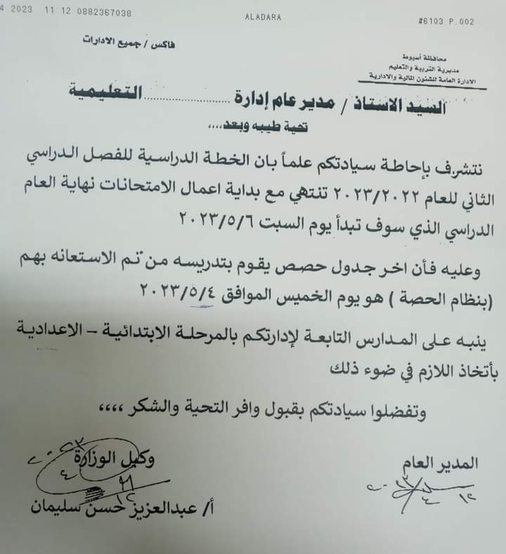 وجهت مديرية التربية والتعليم والتعليم الفني بمحافظة أسيوط فاكس مهم للإدارات بشأن آخر حصة بالفصل الدراسي الثاني للعام 2022/2023 وفق الخطة الدراسية.