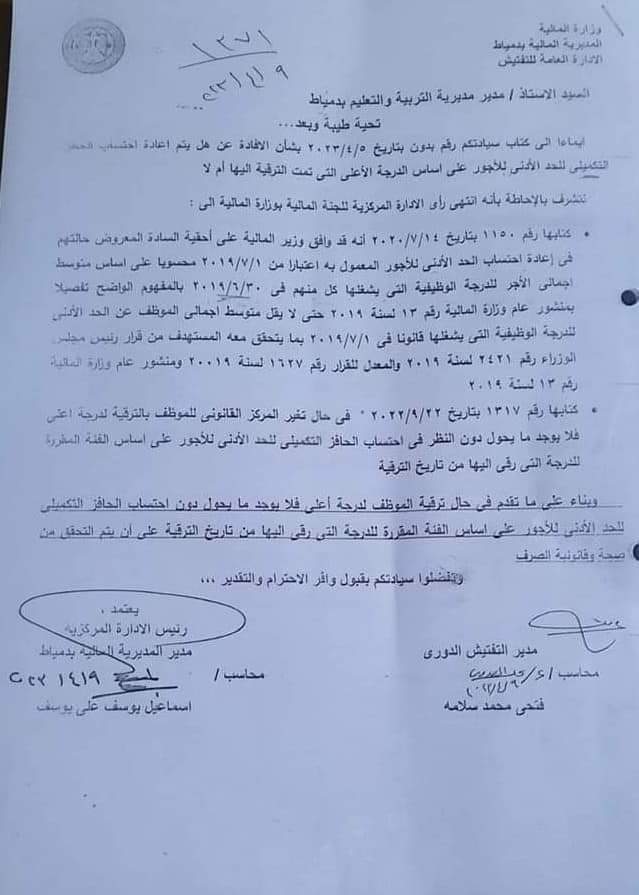 جاء ذلك ردا على طلب مديرية التربية والتعليم والتعليم الفني بدمياط الإفادة عن أحقية إعادة احتساب الحافز التكميلي للحد الأدنى للأجور للمعلمين.