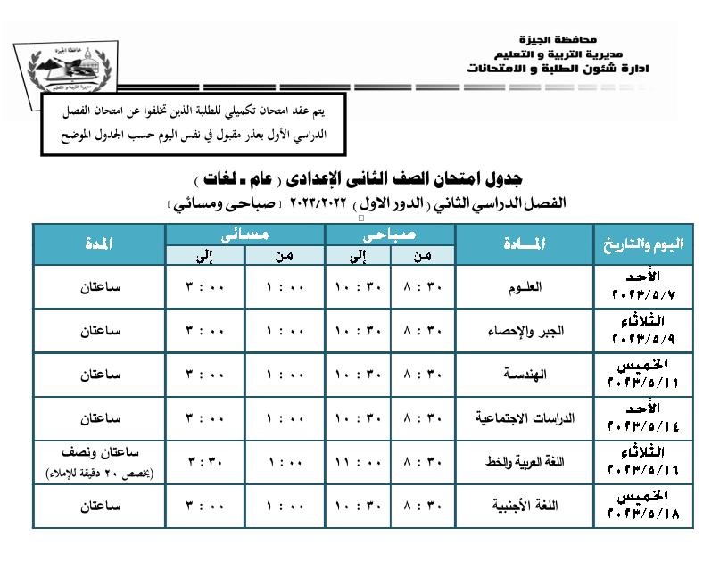 جدول امتحانات الصف الثالث الإعدادي 2023 محافظة الجيزة