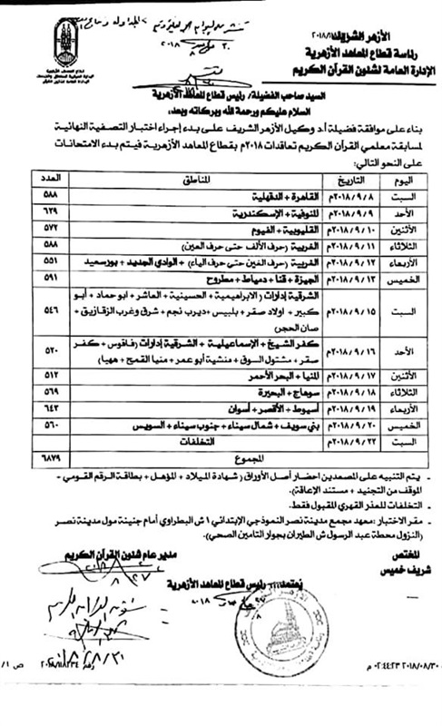 قرر الدكتور عباس شومان وكيل الأزهر الشريف، إجراء اختبارات التصفية النهائية لمسابقة القرآن الكريم تعاقدات 2018، في الثامن من سبتمبر الجاري وحتى الـ22 من الشهر نفسه.