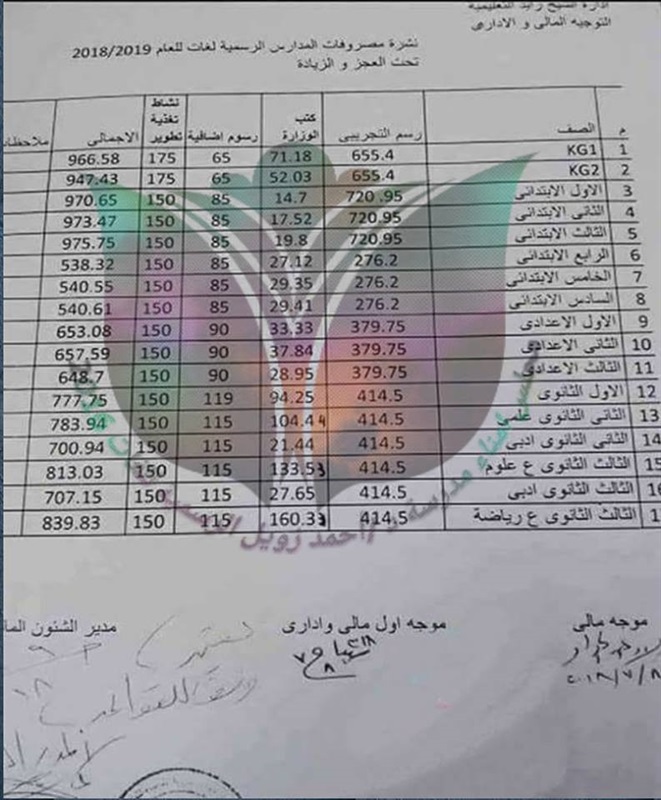 حصل "كشكول" علي نسخة من بيان المصاريف الدراسية للمدارس الرسمية لغات، والذى يشمل رسم التجريبي وكتب الوزارة، إلي جانب رسوم إضافية ونشاط تغذية تطوير.