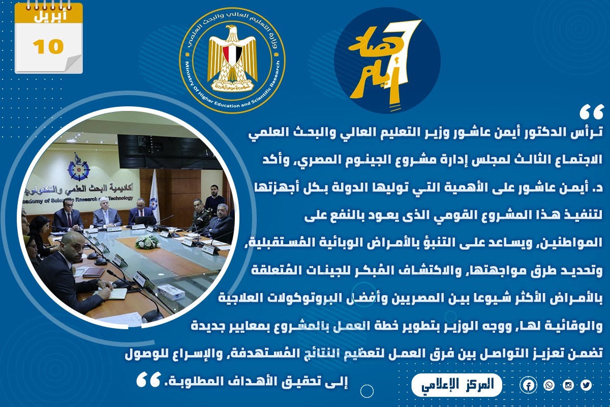 ٢) ترأس الدكتور أيمن عاشور وزير التعليم العالي والبحث العلمي الاجتماع الثالث لمجلس إدارة مشروع الجينوم المصري، مؤكدًا الأهمية التي توليها الدولة بكل أجهزتها لتنفيذ هذا المشروع القومي الذي يعود بالنفع على المواطنين، ويساعد على التنبؤ بالأمراض الوبائية المستقبلية، وتحديد طرق مواجهتها، والاكتشاف المبكر للجينات المتعلقة بالأمراض الأكثر شيوعا بين المصريين وأفضل البروتوكولات العلاجية والوقائية لها.