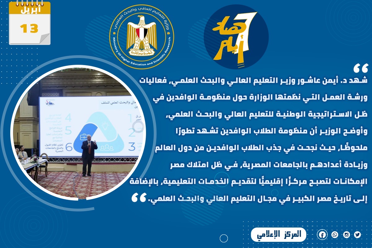 ٧) شهد الدكتور أيمن عاشور وزير التعليم العالي والبحث العلمي، فعاليات ورشة العمل التي نظمتها الوزارة حول منظومة الوافدين في ظل الاستراتيجية الوطنية للتعليم العالي والبحث العلمي، وأوضح الوزير أن منظومة الطلاب الوافدين تشهد تطورًا ملحوظًا، حيث نجحت في جذب الطلاب الوافدين من دول العالم وزيادة أعدادهم بالجامعات المصرية، في ظل امتلاك مصر الإمكانات لتصبح مركزًا إقليميًّا لتقديم الخدمات التعليمية، بالإضافة إلى تاريخ مصر الكبير في مجال التعليم العالي والبحث العلمي.