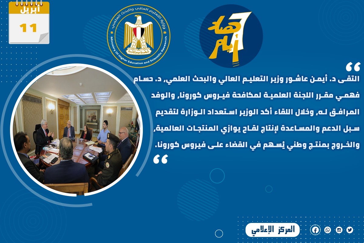 ٤) التقى الدكتور أيمن عاشور وزير التعليم العالي والبحث العلمي، الدكتور حسام فهمي مقرر اللجنة العلمية لمكافحة فيروس كورونا، والوفد المرافق له، وخلال اللقاء أكد الوزير استعداد الوزارة لتقديم