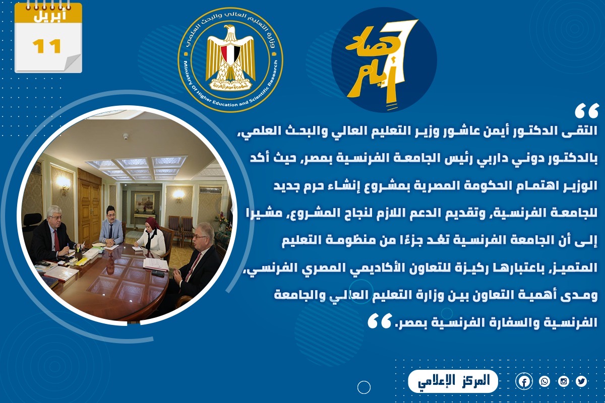 ٥) التقى الدكتور أيمن عاشور وزير التعليم العالي والبحث العلمي، بالدكتور دوني داربي رئيس الجامعة الفرنسية بمصر، حيث أكد الوزير اهتمام الحكومة المصرية بمشروع إنشاء حرم جديد للجامعة الفرنسية، وتقديم الدعم اللازم لنجاح المشروع، مشيراإلى أن الجامعة الفرنسية تعُد جزءًا من منظومة التعليم المتميز، باعتبارها ركيزة للتعاون الأكاديمي المصري الفرنسي، ومدى أهمية التعاون بين وزارة التعليم العالي والجامعة الفرنسية والسفارة الفرنسية بمصر.