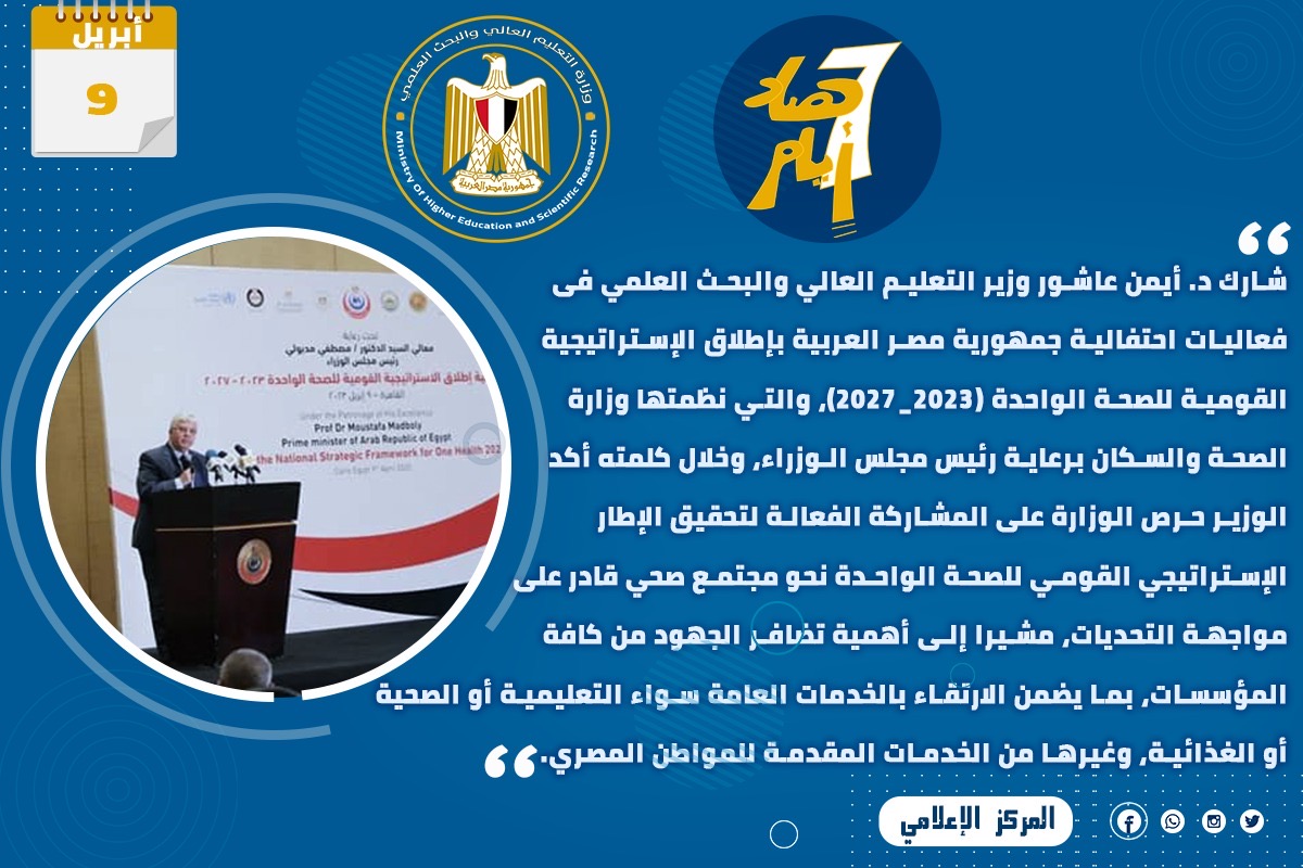 ١) شارك الدكتور أيمن عاشور وزير التعليم العالي والبحث العلمي فى فعاليات احتفالية جمهورية مصر العربية بإطلاق الاستراتيجية القومية للصحة الواحدة (2023-2027)، والتي نظمتها وزارة الصحة والسكان برعاية رئيس مجلس الوزراء، وخلال كلمته أكد الوزير حرص الوزارة على المشاركة الفعالة لتحقيق الإطار الإستراتيجي القومي للصحة الواحدة نحو مجتمع صحي قادر على مواجهة التحديات، مشيرا إلى أهمية تضافر الجهود من كافة المؤسسات، بما يضمن الارتقاء بالخدمات العامة سواء التعليمية أو الصحية أو الغذائية، وغيرها من الخدمات المقدمة للمواطن المصري.