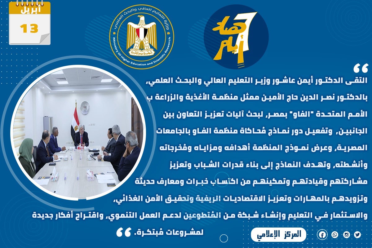 ٦) التقى الدكتور أيمن عاشور وزير التعليم العالي والبحث العلمي، بالدكتور نصر الدين حاج الأمين ممثل منظمة الأغذية والزراعة بالأمم المتحدة "الفاو" بمصر، لبحث آليات تعزيز التعاون بين الجانبين، وتفعيل دور نماذج مُحاكاة منظمة الفاو بالجامعات المصرية، وعرض نموذج المنظمة أهدافه ومزاياه ومُخرجاته وأنشطته، وتهدف النماذج إلى بناء قدرات الشباب وتعزيز مشاركتهم وقيادتهم وتمكينهم من اكتساب خبرات ومعارف حديثة وتزويدهم بالمهارات وتعزيز الاقتصاديات الريفية وتحقيق الأمن الغذائي، والاستثمار في التعليم وإنشاء شبكة من المُتطوعين لدعم العمل التنموي، واقتراح أفكار جديدة لمشروعات مبتكرة.