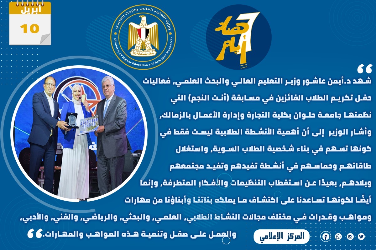 ٣) شهد الدكتور أيمن عاشور وزير التعليم العالي والبحث العلمي، فعاليات حفل تكريم الطلاب الفائزين في مسابقة (أنت النجم) التي نظمتها جامعة حلوان بكلية التجارة وإدارة الأعمال بالزمالك، مشيرًا إلى أن أهمية الأنشطة الطلابية ليست فقط في كونها تسهم في بناء شخصية الطلاب السوية، واستغلال طاقاتهم وحماسهم في أنشطة تفيدهم وتفيد مجتمعهم وبلادهم، بعيدًا عن استقطاب التنظيمات والأفكار المتطرفة، وإنما أيضًا لكونها تساعدنا على اكتشاف ما يملكه بناتنا وأبناؤنا من مهارات ومواهب وقدرات في مختلف مجالات النشاط الطلابي، العلمي، والبحثي، والرياضي، والفني، والأدبي، والعمل على صقل وتنمية هذه المواهب والمهارات.