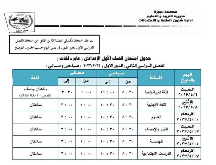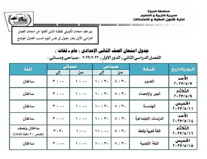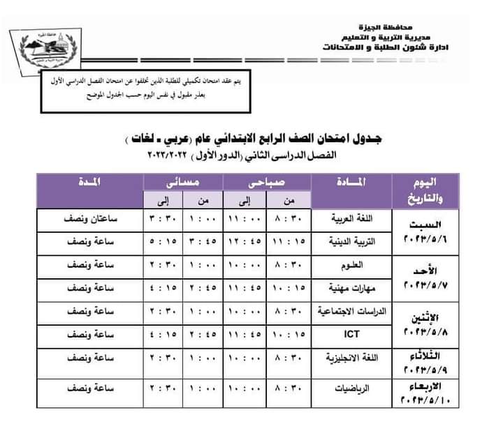 ويمكن مطالعة جداول امتحانات الترم الثاني لجميع الصفوف بالجيزة من الصور التالية: