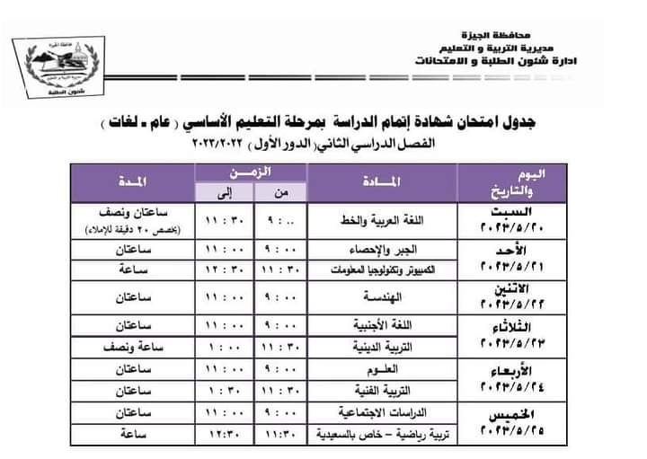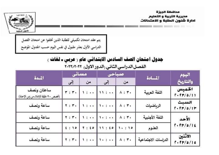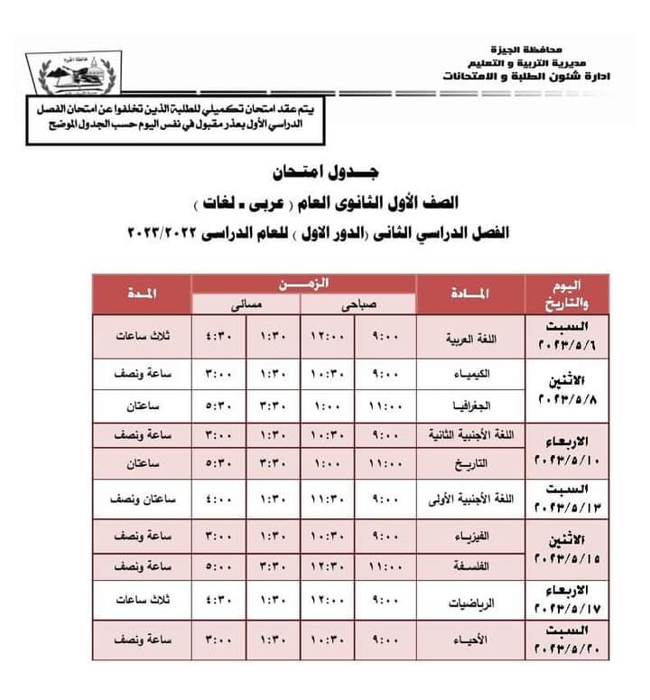 حيث اعتمد اللواء أحمد راشد محافظ الجيزة، وأشرف سلومة وكيل وزارة التربية والتعليم بالجيزة، مواعيد امتحانات الفصل الدراسي الثانى الدور الأول " أخر العام" للعام الدراسي 2022/2023 وفقًا للمواعيد التالية: -