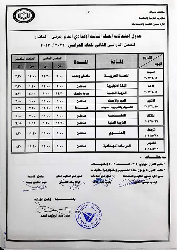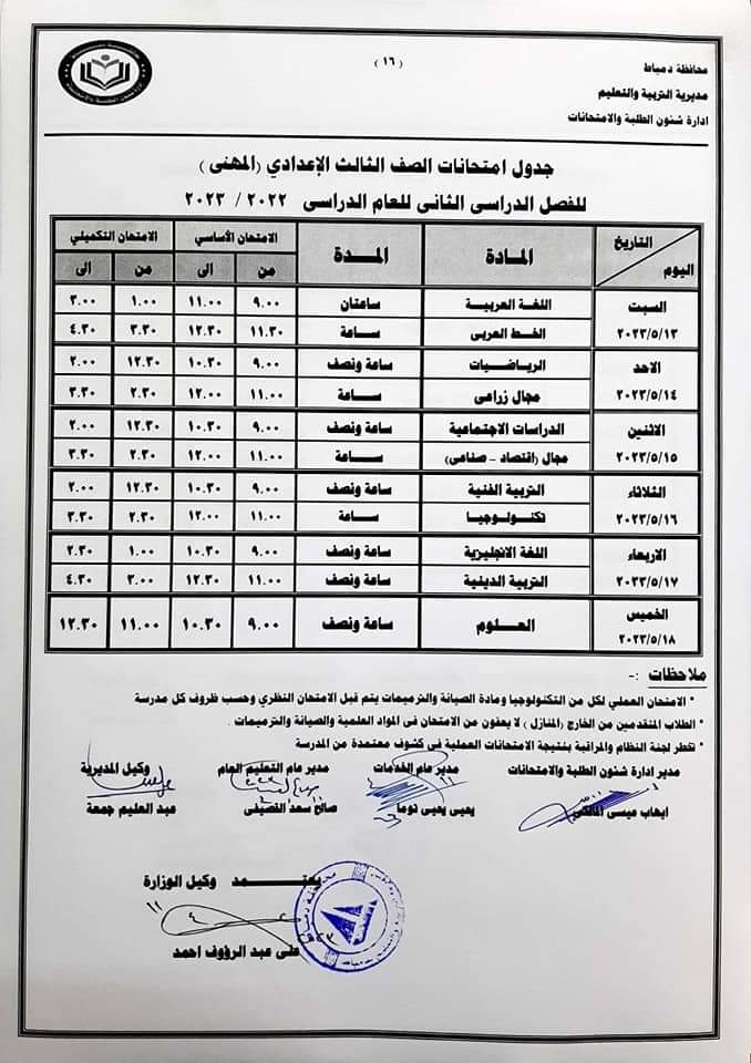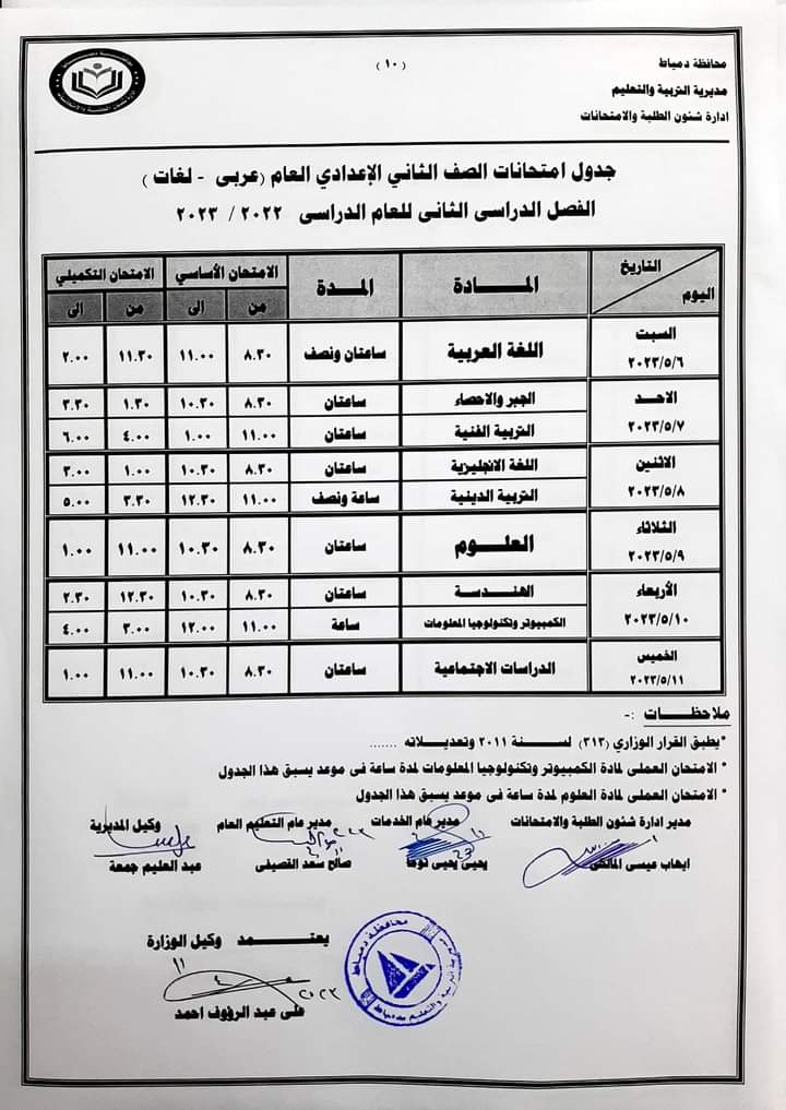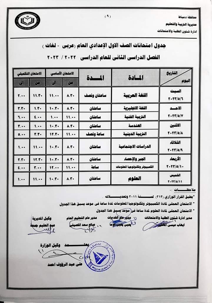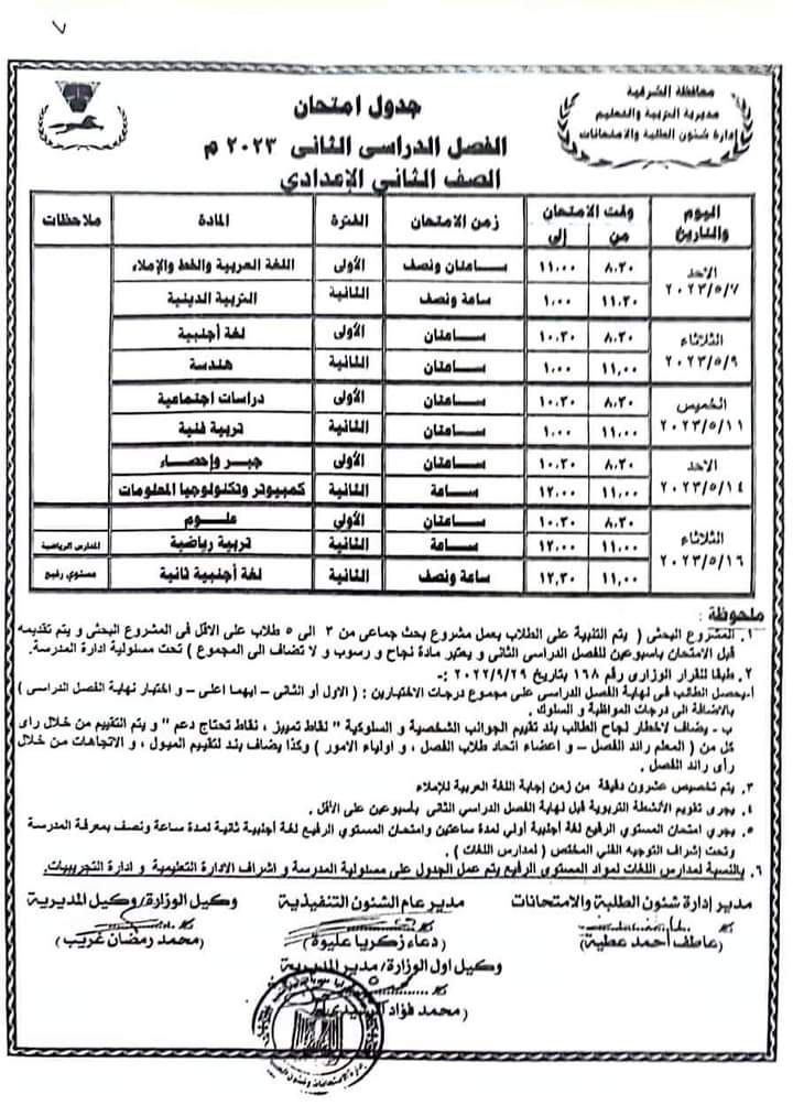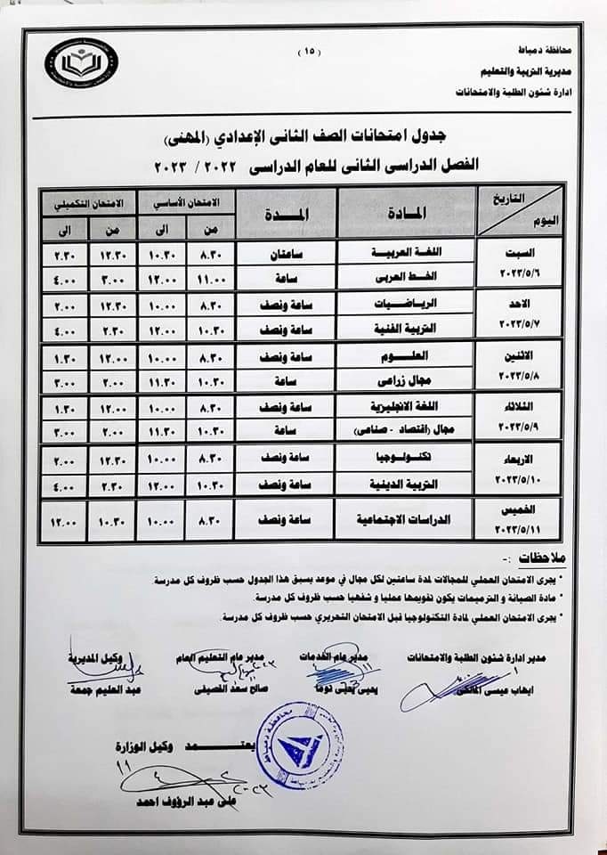 كما أعلنت جداول امتحانات الصفوف الأول والثاني والثالث الإعدادي والأول والثاني الثانوي العام والفني بجميع نوعياته تجاري وفندقي وصناعي وزراعي للفصل الدراسي الثاني للعام 2022/2023.
