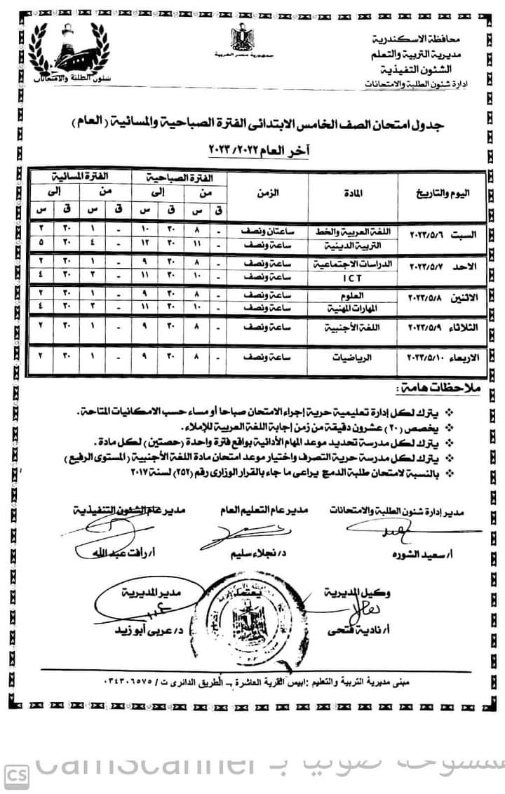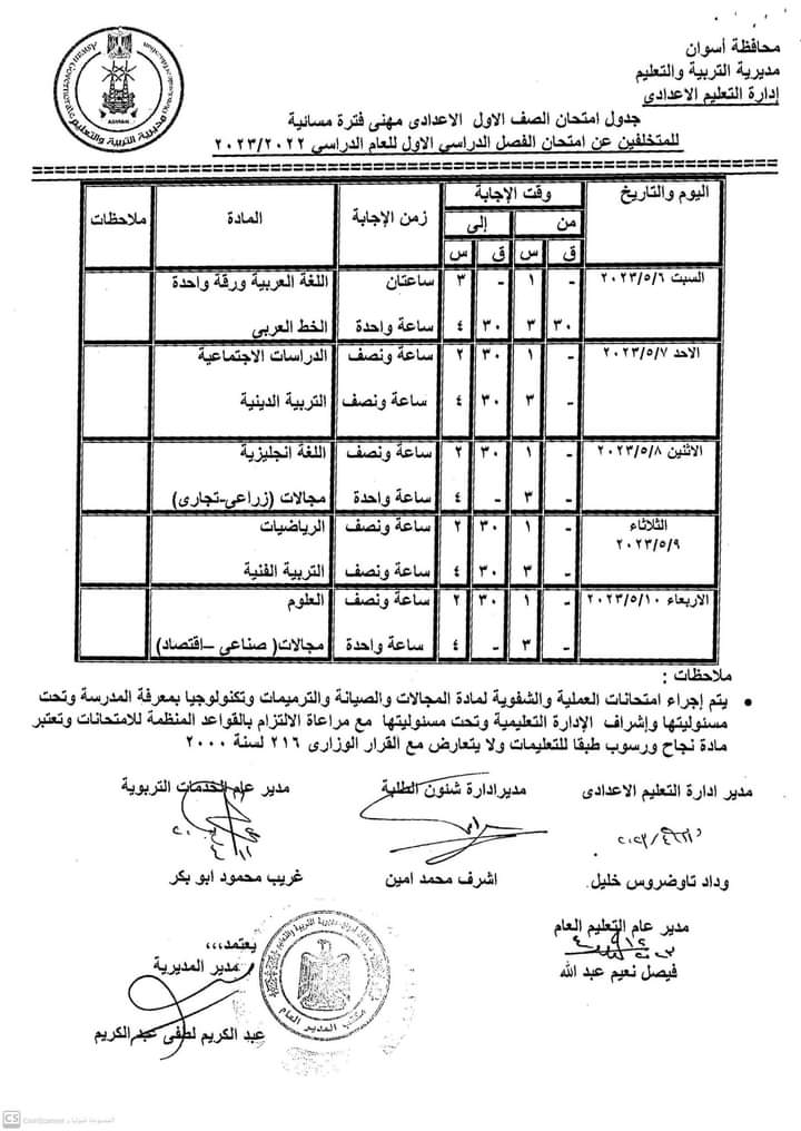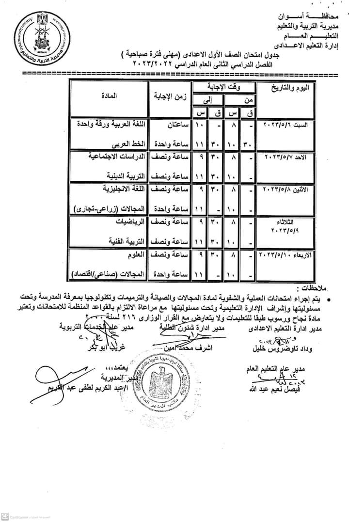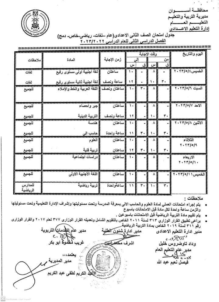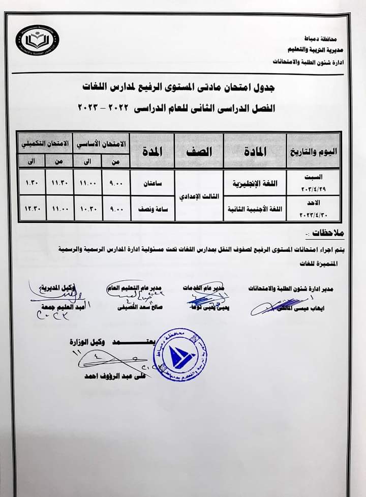 كما أعلنت جداول امتحانات الصفوف الأول والثاني والثالث الإعدادي والأول والثاني الثانوي العام والفني بجميع نوعياته تجاري وفندقي وصناعي وزراعي للفصل الدراسي الثاني للعام 2022/2023.