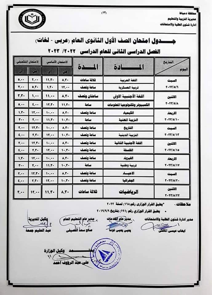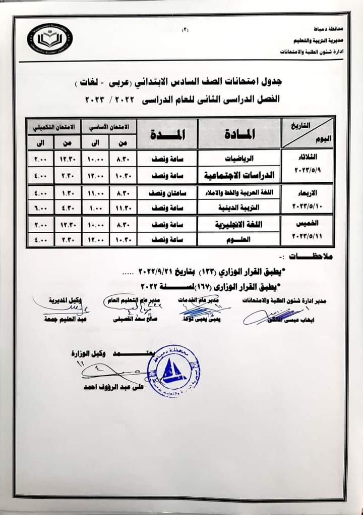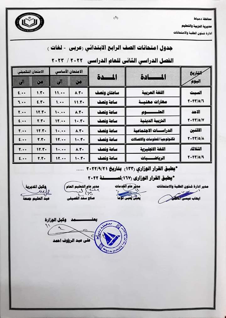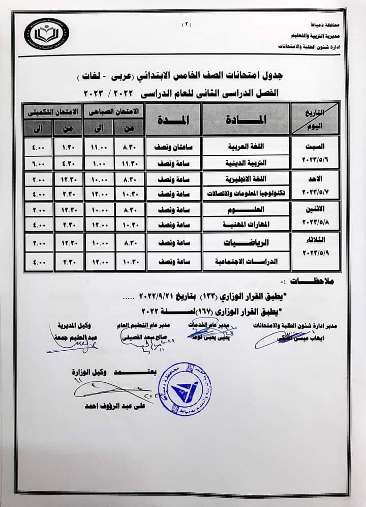 - يوم السبت الموافق 20/5/2023 في مادتي اللغة العربية والخط والإملاء والتربية الدينية.