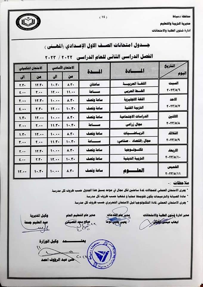 - الصف الثالث الإعدادي العام من يوم الأحد الموافق ١٤ مايو وحتى السبت ٢٠ مايو.