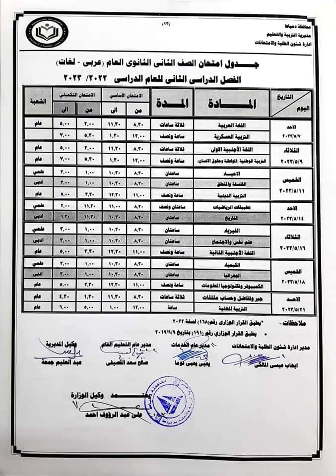 - يوم الثلاثاء الموافق 23/5/2023 في مادتي الهندسة والكمبيوتر وتكنولوجيا المعلومات.