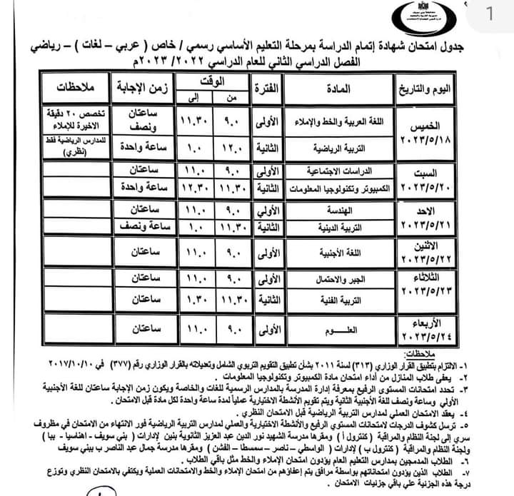 - يوم الأحد الموافق 21/5/2023 في مادتي الجبر والإحصاء والتربية الفنية.