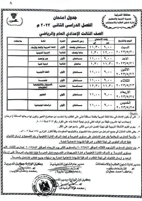اعتمد الدكتور ممدوح غراب محافظ الشرقية، جدول امتحانات الفصل الدراسي الثاني للصف الثالث الإعدادي ( العام – الرياضي ) للعام الدراسي 2022 / 2023 بجميع الإدارات التعليمية بنطاق المحافظة والتي ستبدأ السبت 20 مايو وتنتهي الخميس 25 مايو 2023.