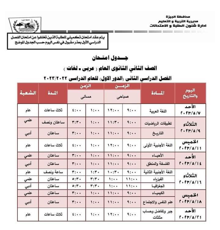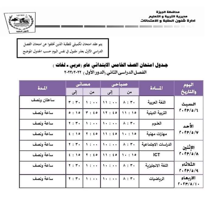 ويمكن مطالعة جداول امتحانات الترم الثاني لجميع الصفوف بالجيزة من الصور التالية: