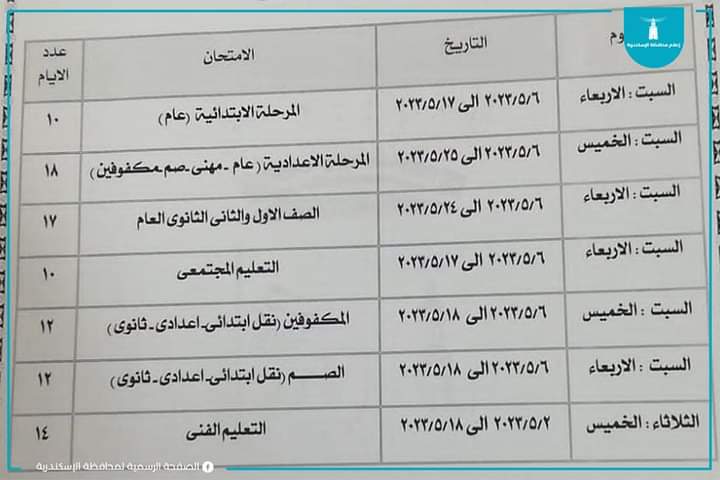 - وتجرى امتحانات الشهادة الإعدادية للمكفوفين من يوم الأحد الموافق ١٤ مايو وحتى السبت ٢٠ مايو.