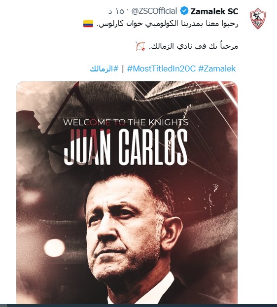 نشرت الصفحة الرسمية لنادى الزمالك، صورة للكولومبى خوان كارلوس أسوريو،المدير الفني الجديد للفريق الأبيض عبر موقع التواصل الاجتماعى تويتر، معلقة عليها:"رحبوا معنا بمدربنا الكولومبي خوان كارلوس،مرحبًا بك في نادي الزمالك".