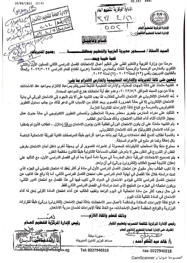وشددت الوزارة على ضرورة أن يتم تصحيح الامتحانات الورقية داخل المدرسة في سرية تامة أسوة بما تم في الفصل الدراسي الأول مع التنبيه على إعلان النتيجة لجميع الطلاب والكتروني ورقي) في آن واحد.
