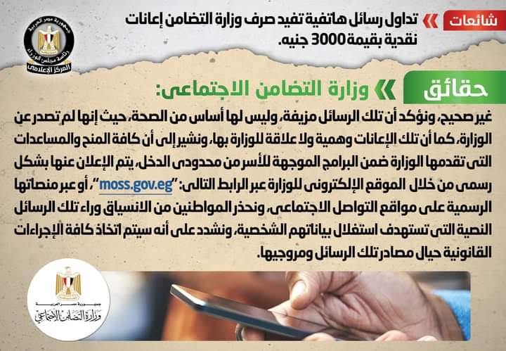 وقام المركز الإعلامي لمجلس الوزراء بالتواصل مع وزارة التضامن الاجتماعي والتي نفت تلك الأنباء مُؤكدةً أنه لا صحة للرسائل الهاتفية المتداولة والتي تفيد صرف وزارة التضامن إعانات نقدية بقيمة 3000 جنيه، وأن تلك الرسائل مزيفة، وليس لها أساس من الصحة، حيث إنها لم تصدر عن الوزارة، كما أن تلك الإعانات وهمية ولا علاقة للوزارة بها.