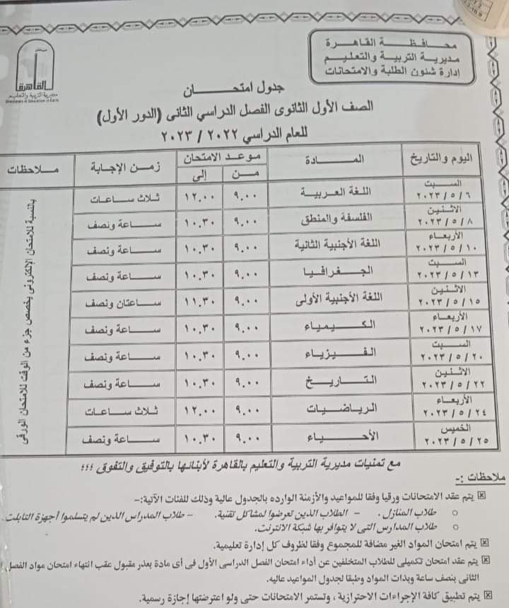وجاء جدول امتحانات الأول الثانوي بالقاهرة كالآتي: