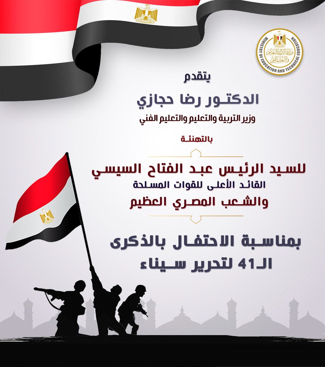 تقدم الدكتور رضا حجازي وزير التربية والتعليم والتعليم الفني، بالأصالة عن نفسه وبالإنابة عن جموع العاملين بالوزارة والمعلمين، بأسمى آيات التهاني للرئيس عبد الفتاح السيسي القائد الأعلى للقوات المسلحة والشعب المصري العظيم بمناسبة الاحتفال بالذكرى الـ٤١ لتحرير سيناء.