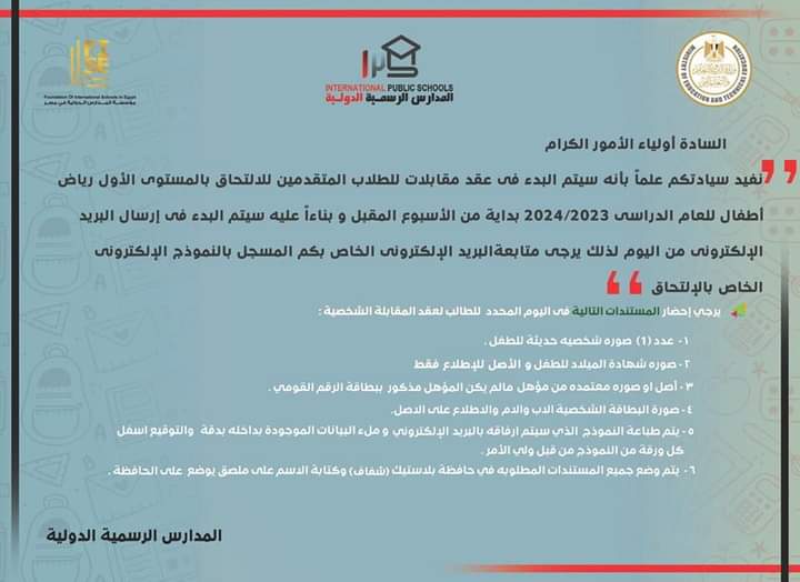 أعلنت المدارس الرسمية، انه سيتم البدء فى عقد مقابلات للطلاب المتقدمين للالتحاق بالمستوى الأول رياض أطفال للعام الدراسى 2024/2023 بداية من الأسبوع المقبل.