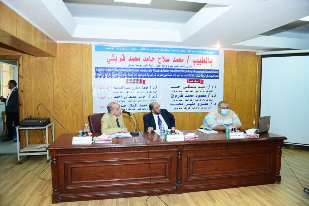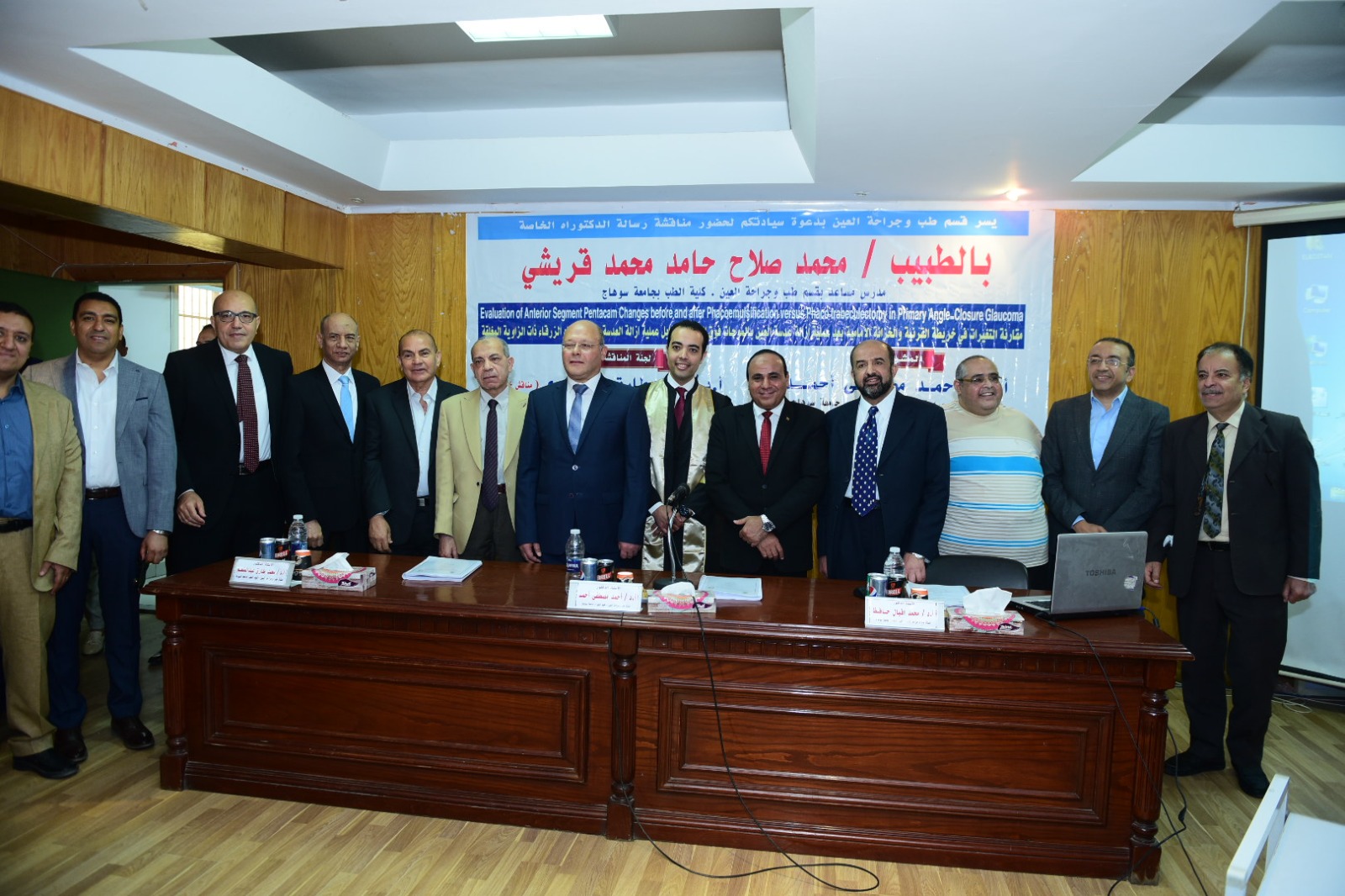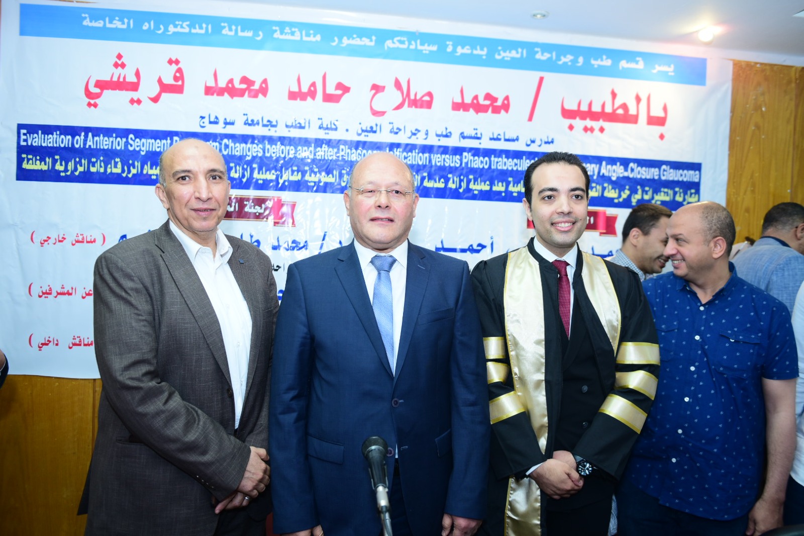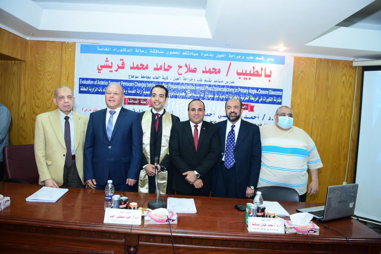 ناقشت كلية الطب البشري جامعة سوهاج، وسط كوكبة من أساتذة طب وجراحة العيون بجامعتي سوهاج وأسيوط، رسالة الدكتوراه المقدمة من الطبيب محمد صلاح حامد محمد قريشي مدرس مساعد بقسم طب وجراحة العيون بالكلية، وذلك بحضور الدكتور حسان النعماني نائب رئيس الجامعة للدراسات العليا والبحوث، والدكتور خالد عمران نائب رئيس الجامعة لخدمة المجتمع وتنمية البيئة، والدكتور جمال عبداللطيف رضوان عميد كلية الطب الأسبق، والدكتور حاتم عمار رئيس قسم جراحة العيون، ونخبة من أعضاء مجلس النواب والشيوخ والقيادات بالمحافظة، وأعضاء هيئة التدريس بقسم طب وجراحة العيون والأقسام الطبية المختلفة بكلية الطب.