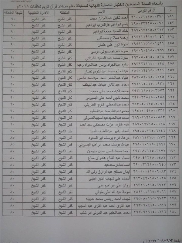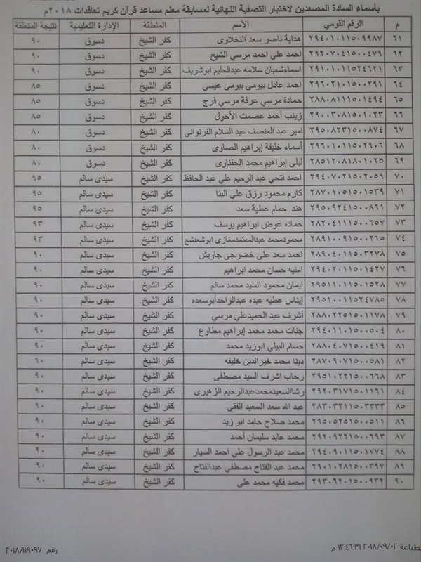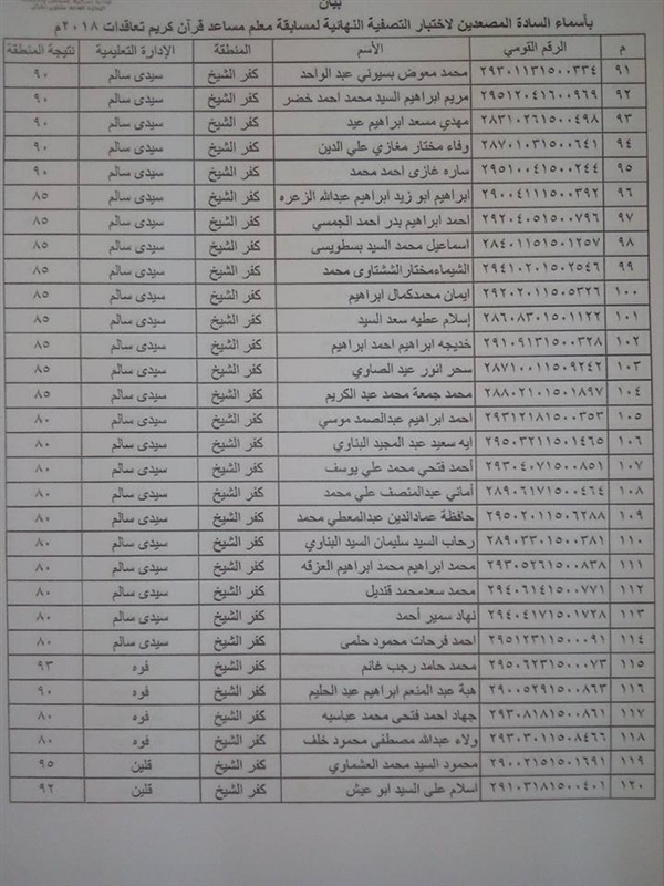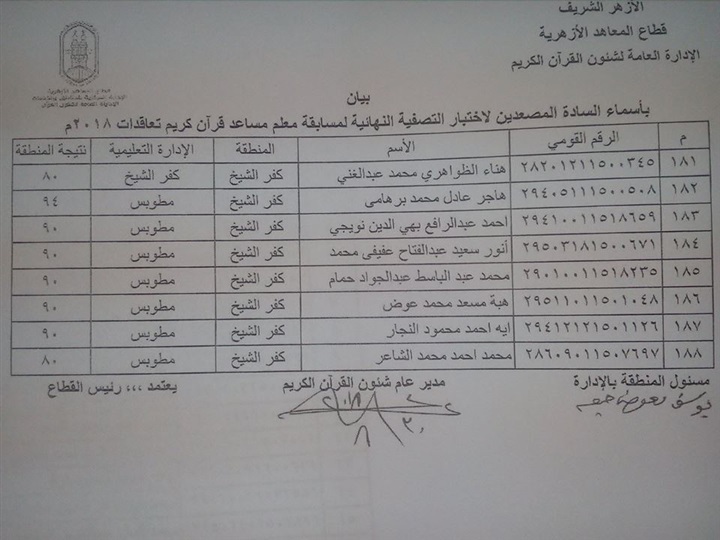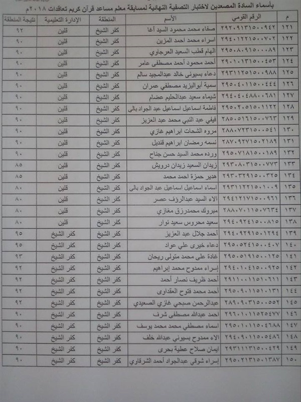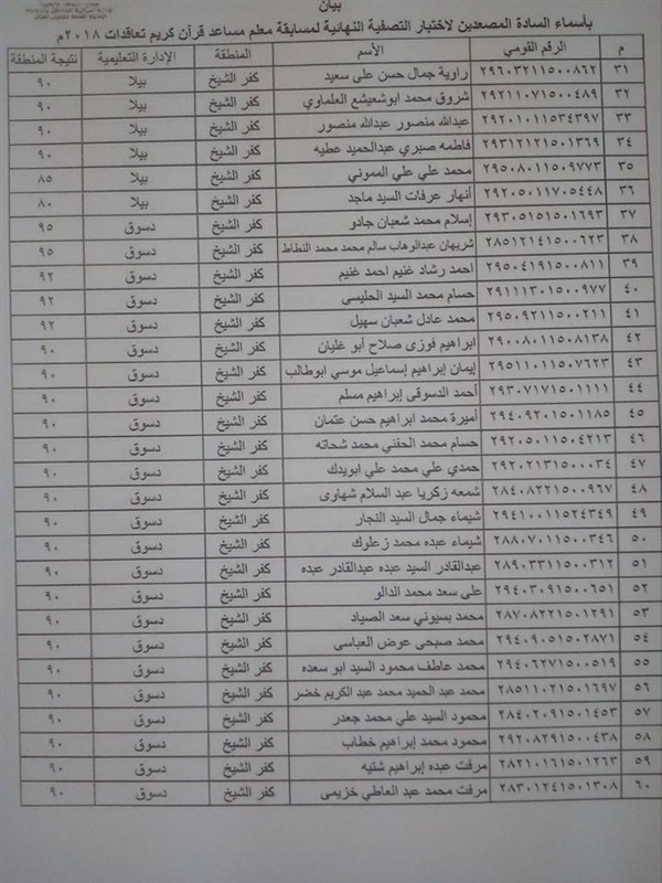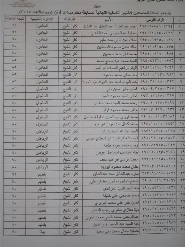 حصل "كشكول" على كشوف أسماء المصعدين لاختبار التصفية النهائية لمسابقة معلم مساعد قرآن كريم تعاقدات 2018، في منطفة كفر الشيخ الأزهرية.