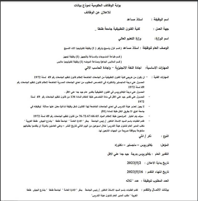 الوصف العام للوظيفة: أستاذ مساعد "قسم غزل ونسيج وتريكو (1) وظيفة تكنولوجيا آلات النسيج، قسم طباعة المنسوجات والصباغة والتجهيز (1) وظيفة تجهيز، قسم الملابس الجاهزة وصناعة الموضة (1) وظيفة تكنولوجيا ملابس".