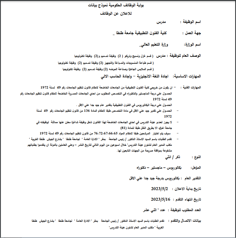 الوصف العام للوظيفة: مدرس "قسم غزل ونسيج وتريكو (2) وظيفة تصميم و(2) وظيفة تكنولوجيا، قسم طباعة المنسوجات والصباغة والتجهيز (2) وظيفة تصميم (2) وظيفة تكنولوجيا، قسم الملابس الجاهزة وصناعة الموضة (2) وظيفة تصميم (2) وظيفة تكنولوجيا".