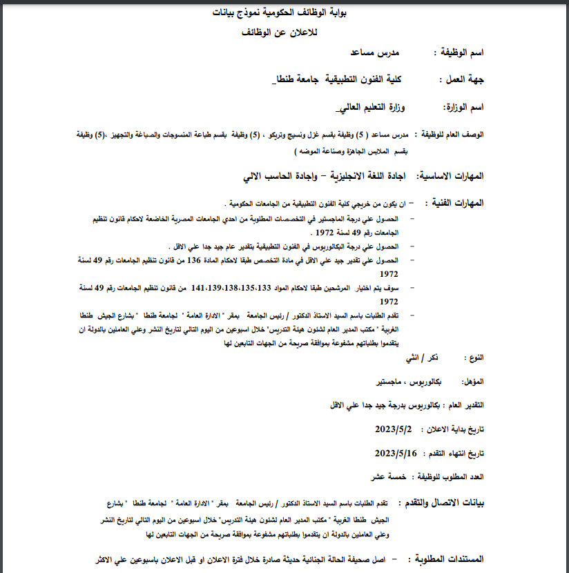 الوصف العام للوظيفة: مدرس مساعد "(5) وظيفة بقسم غزل ونسيج وتريكو، (5) وظيفة بقسم طباعة المنسوجات والصباغة والتجهيز (5) وظيفة بقسم الملابس الجاهزة وصناعة الموضة".