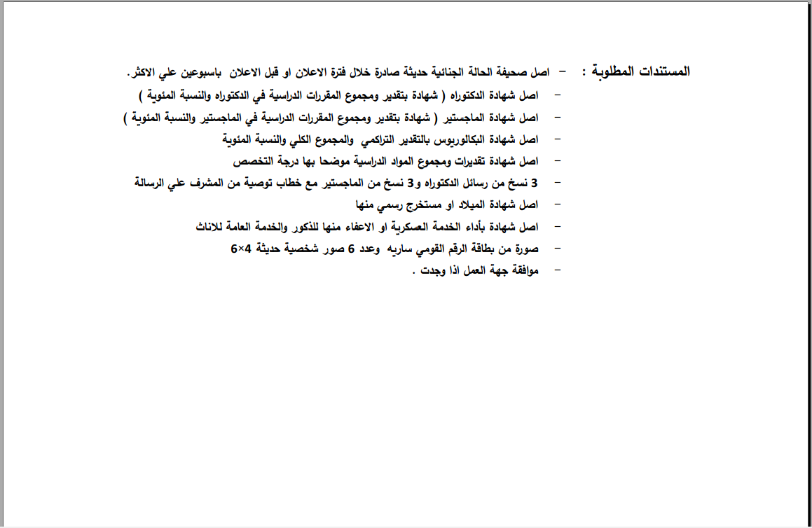 - الحصول على درجة الماجستير والدكتوراه في التخصص المطلوب من إحدى الجامعات المصرية الخاضعة لأحكام قانون تنظيم الجامعات رقم 49 لسنة 1972.