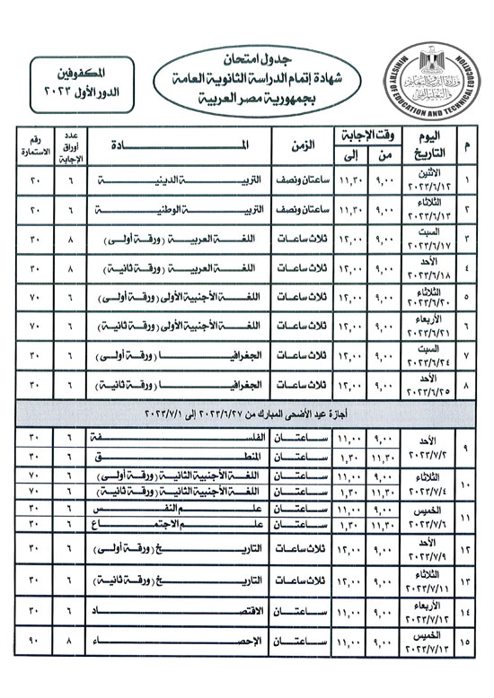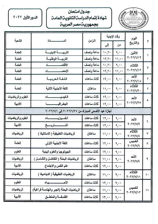 جدول امتحانات الثانوية العامة 2023