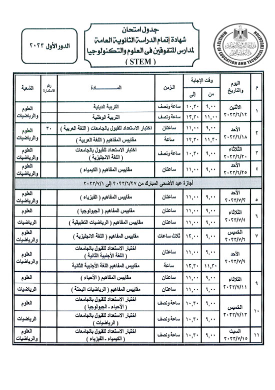 - الخميس 6 يوليو اللغة الأجنبية الأولى والأحد 9 يوليو 2023، الجيولوجيا والعلوم البيئية لطلاب شعبة علمى علوم والتفاضل والتكامل لطلاب شعبة علمى رياضة وعلم النفس والاجتماع لطلاب الشعبة الأدبية.